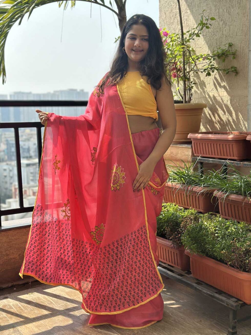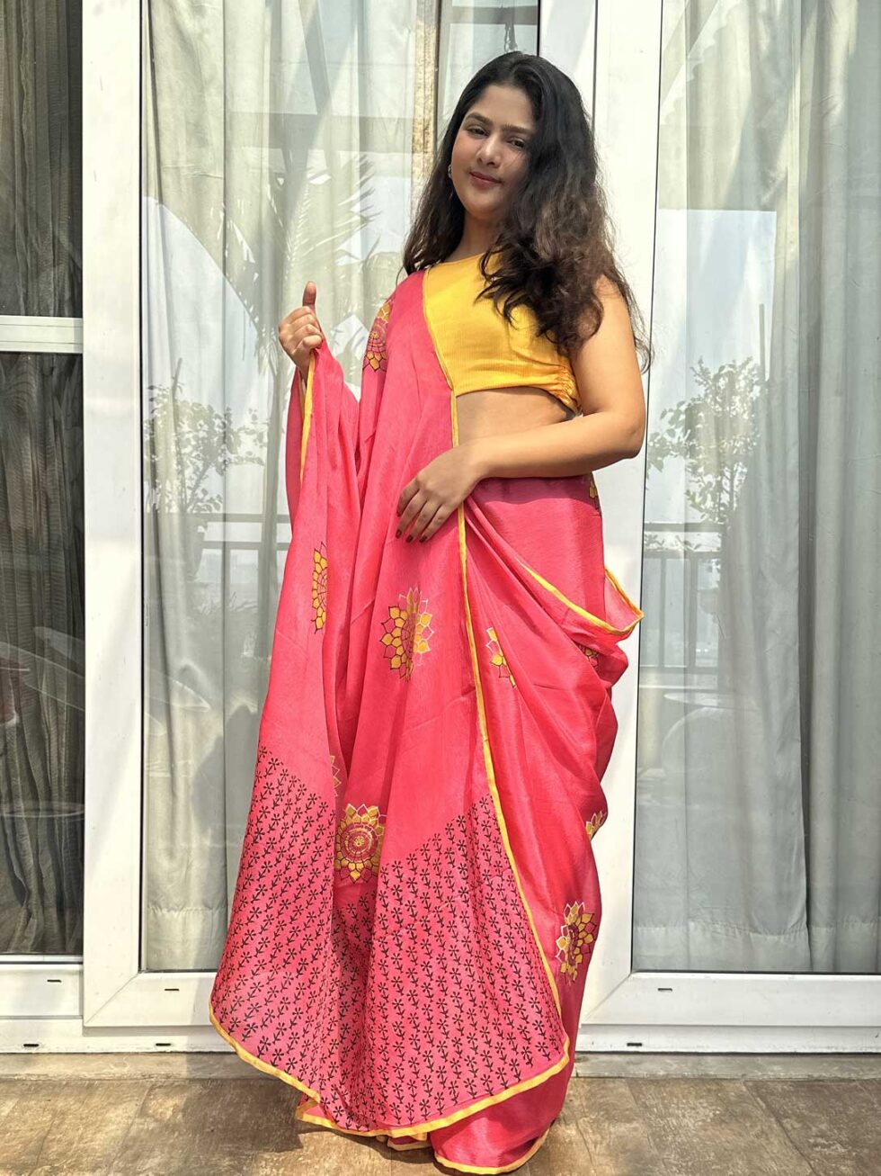A playful fusion of tradition and trend, this georgette saree showcases the charm of the chinon saree with hand block printing for a fresh, modern look. Paired with a blouse, it adds a touch of bold elegance while ensuring comfort and ease.