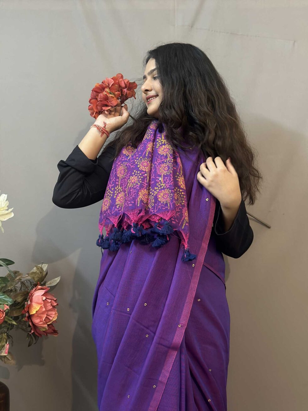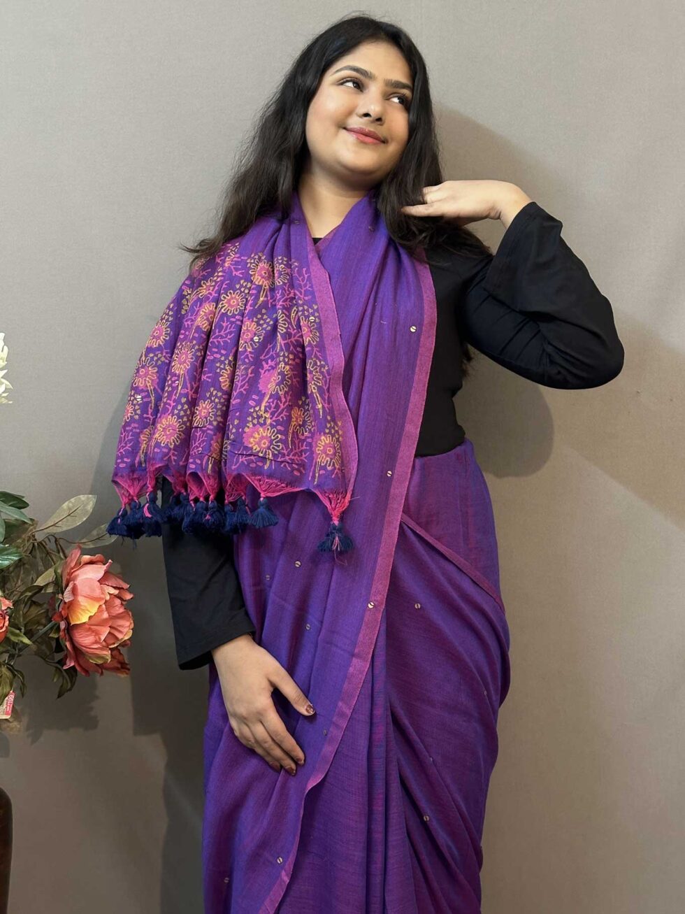 Linen sarees with hand-block prints are a stunning fusion of tradition and contemporary elegance. Crafted from breathable linen fabric, these sarees showcase intricate hand-block prints, where skilled artisans use wooden blocks and natural dyes to create mesmerising patterns.